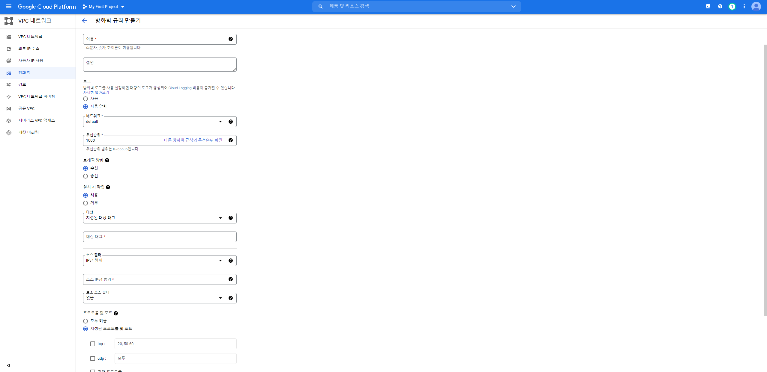 • 이름 탭에 방화벽 규칙 명 입력