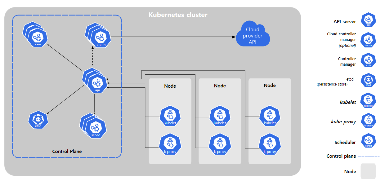 - Control Plane(Master Node)는 클러스터를 컨트롤하기 위한 기능들을 제공하며 클러스터 전역에 걸친 의사결정과 클러스터 이벤트 감지 및 응답을 함