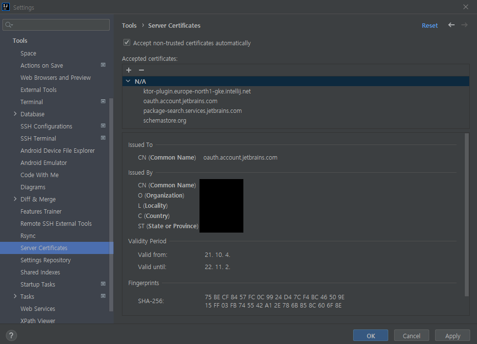 - 해당 알람이 발생할 경우 Settings에서 Server Certificates에서 인증서 관련 옵션을 체크하면됨