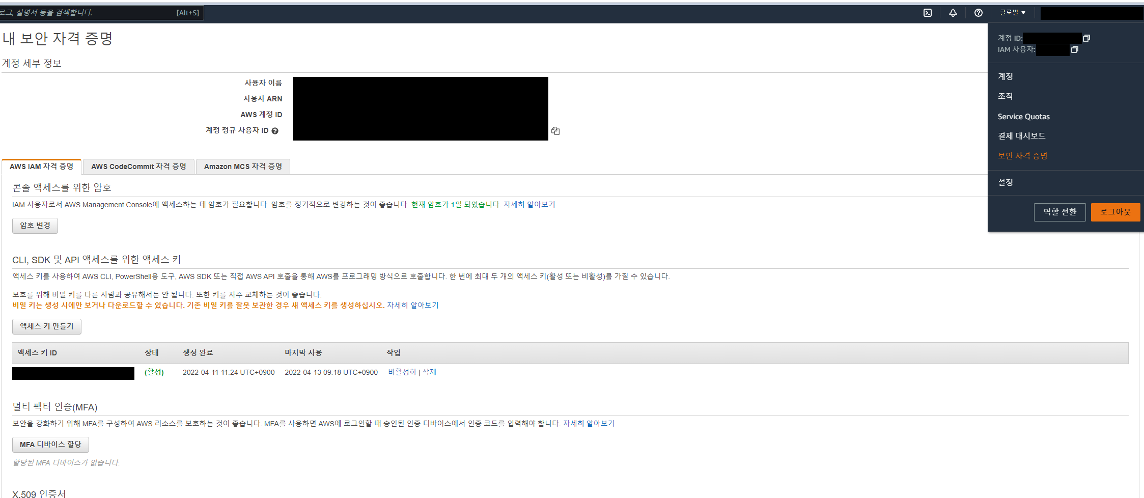 - 우측 상단에서 보안자격증명 클릭