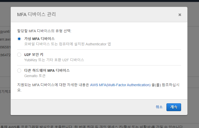 - 가상 MFA 디바이스 선택 (Google Authenticator로 진행할 것이라, MFA 디바이스로 선택)
