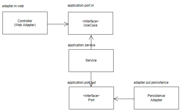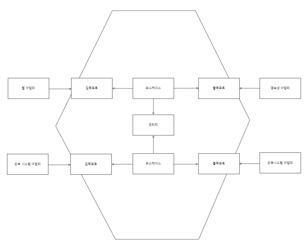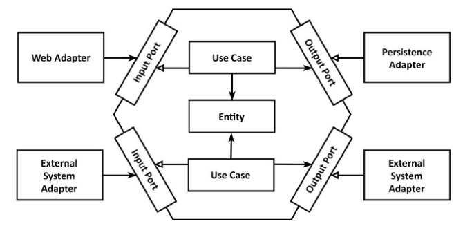 - 육각형 안에는 도메인 엔티티와 상호작용하는 유스케이스가 있음, 육각형에서 외부로 향하는 의존성이 없고 모든 의존성이 코어로 향함