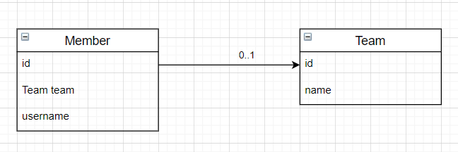 - 회원 객체와 팀 객체는 단방향 관계 (회원객체에서 팀으로 member.getTeam()으로 가능하지만 Team은 접근필드가 없음 불가)