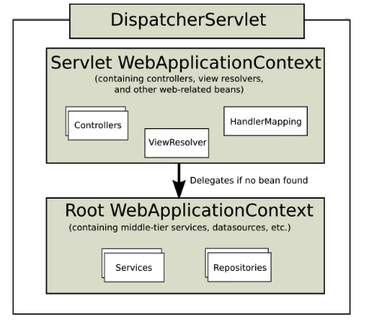 • Servlet WebApplicationContext는 Root WebApplicationContext를 상속받아 만들어짐, 해당 DispatchServlet에 Controller, View 같은 Bean들이 등록