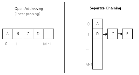 - Open Addressing : 해시충돌 발생시 인접 인덱스 값을 구해서 해시 충돌을 우회하는 방법