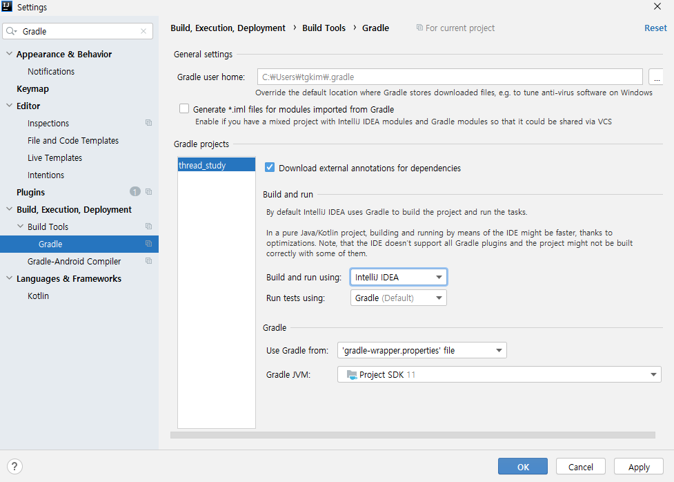 - Settings -> Build, Execution, Deployment -> Build Tools Gradle -> Build and run using을 IntelliJ로 변경
